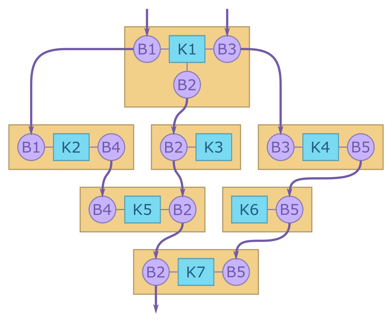 Before considering "bad" graphs, let's recap what a graph looks like to the OpenCL API and what some of the features of a "good" graph are. Figure 1 shows a fictitious execution graph. It has kernels (functions) K1 - K7 and memory buffers B1 - B5. The kernels operate on the memory buffers, as shown by the orange boxes. E.g., when K1 executes, it accesses B1, B2, and B3. K1 must use B1 before K2 can use B1. The application writes to buffers B1 and B3 via the OpenCL API before any kernels are executed. These are the inputs to the graph. The application reads from buffer B2 via the OpenCL API after the last kernel is executed. This is the output of the graph. The other buffers are only used on the accelerator device, and their contents may not be visible to the application at all.