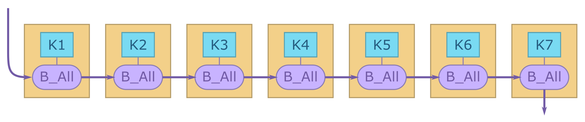 Now, consider the fictitious "bad" graph in figure 2. The graph has the same number of kernels, but the developer has decided to store all the data in a single, unified buffer. B1 - B5 from figure 1 have been concatenated into B_All. The graphs in figure 1 and 2 could well be functionally equivalent. In figure 1, K1 operates on all the data in B1, B2, and B3, but in figure 2, K1 operates on only some of the data in B_All (the data that corresponds to B1, B2, and B3).