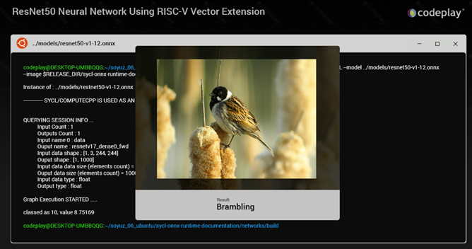 Our Research team has developed a deep learning application that take full advantage of the Acoran platform, using ResNet-50, the ONNX open-source formats for neural networks and supporting operations from libraries such as SYCL-BLAS. The result demonstrates how our software stack seamlessly enables acceleration of software on RISC-V using the RISC-V Vector extension.
