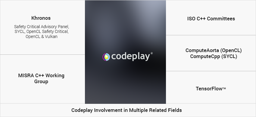 Most of the software that Codeplay create uses C++ '11 or C++ '14 and so applying the MISRA C++ standard to their codebase is a challenge. By Codeplay participating in the various bodies concerned it is in a unique position to monitor and contribute to relevant groups ensuring the emerging C++ standards, software quality standards and open standards are compatible with real life use cases. We are actively involved in the development of TensorFlow as a typical use case for SYCL on highly parallel low power systems, and have first-hand experience of the issues C++ can present when looking at the safety domain. ComputeAorta and ComputeCpp (our implementations of OpenCL and SYCL) are part of the deep learning software stack at Codeplay. We see this experience as critical in helping influence the relevant workgroups to ensure conflicts of interest are minimized when defining separate new standards in the various domains inside and outside the automotive industry.