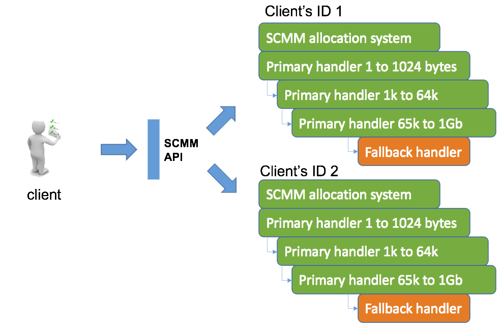 Figure 3 shows how our SCMM can facilitate using different allocation systems together to get the best efficiency for the client application on any particular hardware. Each of the primary handlers in the diagram represents an instance of an allocation algorithm. In this case, each allocation algorithm is filtering on the size of the requested allocation block, to judge whether it is suitable to store in its container. If not, the request falls through to the next allocation algorithm or filter. If none of the configured handlers can handle the allocation request, the last resort Fallback handler takes control, which could mean returning an error condition or using some memory reserve.