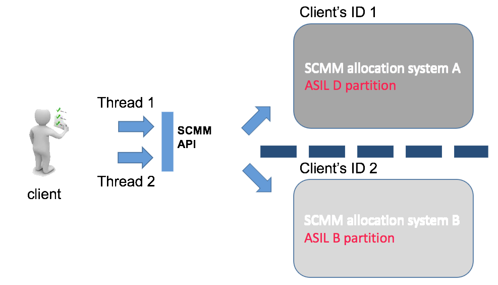 Figure 4 shows an extension to Figure 3’s model, to facilitate the partitioning of allocation systems to accommodate Automotive Safety Integrity Level (ASIL) decomposition and partitioning. For the purposes of this blog, it is greatly simplified to show the principle. ASIL is an ISO 26262 categorisation for the identified level of risk to cause injury to the occupants of a vehicle, should the item fail to operate within its normal expected behaviour. ASIL A is the lowest level of risk, with the highest level, ASIL D, representing risk of death or serious injury. The diagram in Figure 4 shows ISO 26262 ASIL decomposition and how an item (the client software) could mitigate risk of interference from a less rigorously tested ASIL B-rated component harming the critical ASIL D-rated functionality. Decomposition allows architects to reduce the complexity of the software and the rigor of the quality management process for some parts of a system. That reduces cost by not having to apply such rigor to the whole system, while achieving the overall ASIL D safety goal.