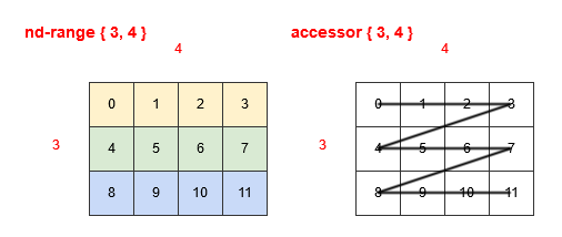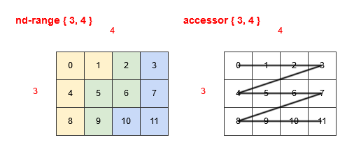 This concept of linearization also applies in how the coordinates of an accessor's two-dimensional data space linearize into a linearized space where consecutive elements are contiguous in memory. This is where it becomes important for performance because depending on whether the linearization of the nd_range iteration space matches the linearization of the accessor data space.