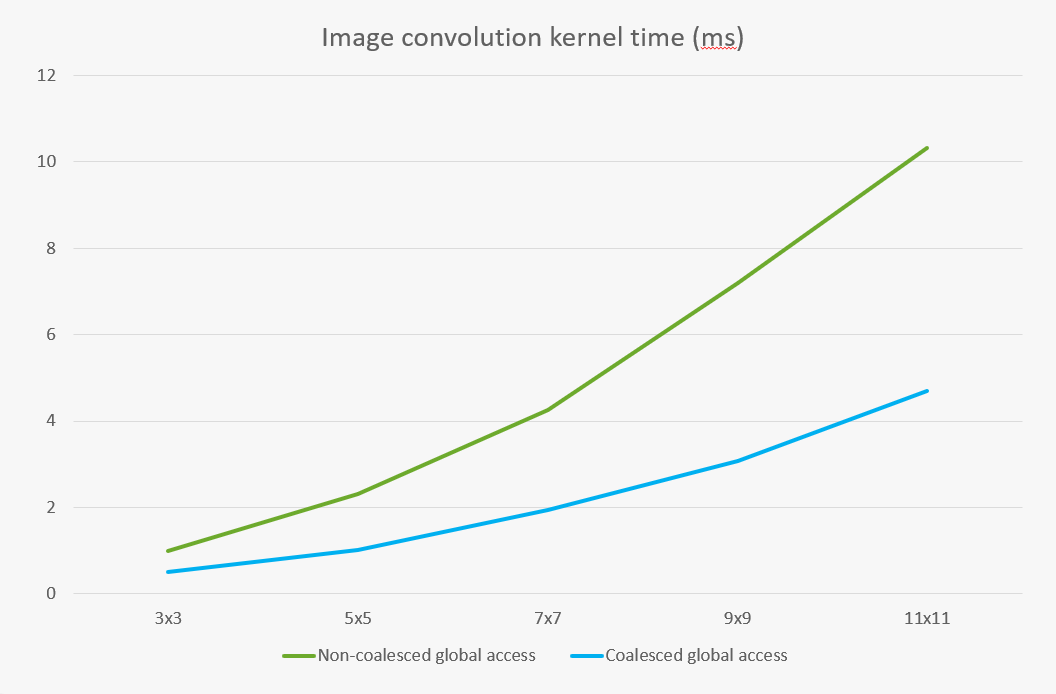 Figure 3: Kernel timings comparing coalesced and on-coalesced global memory access