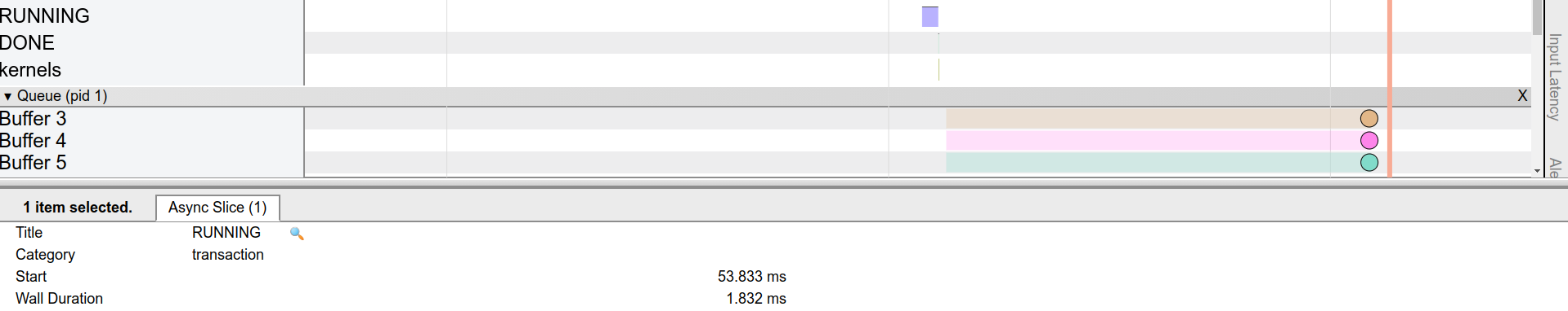 Based on the selected option for profiling, the chrome tracing view will display information about the memory objects (buffers) and the queue activity.