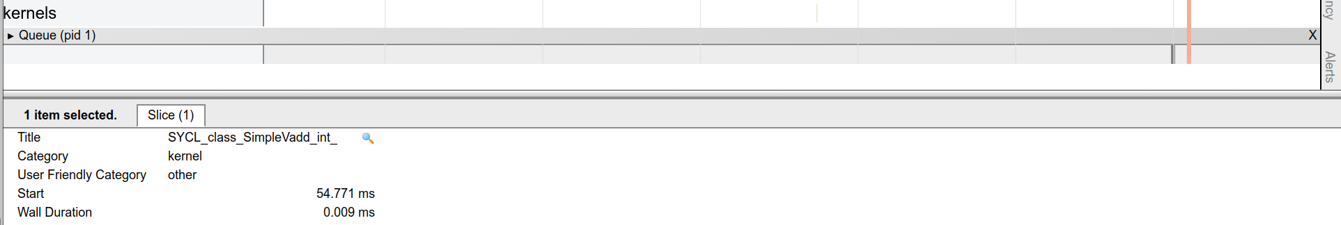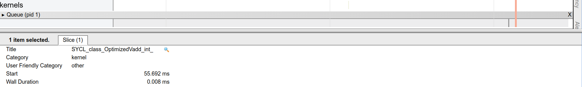 As you can see, you can track every start and duration of a command on the device. The same can be done for Queue (pid 1) which is the second reference of the queue with the SimpleVadd kernel for vectors of type float.