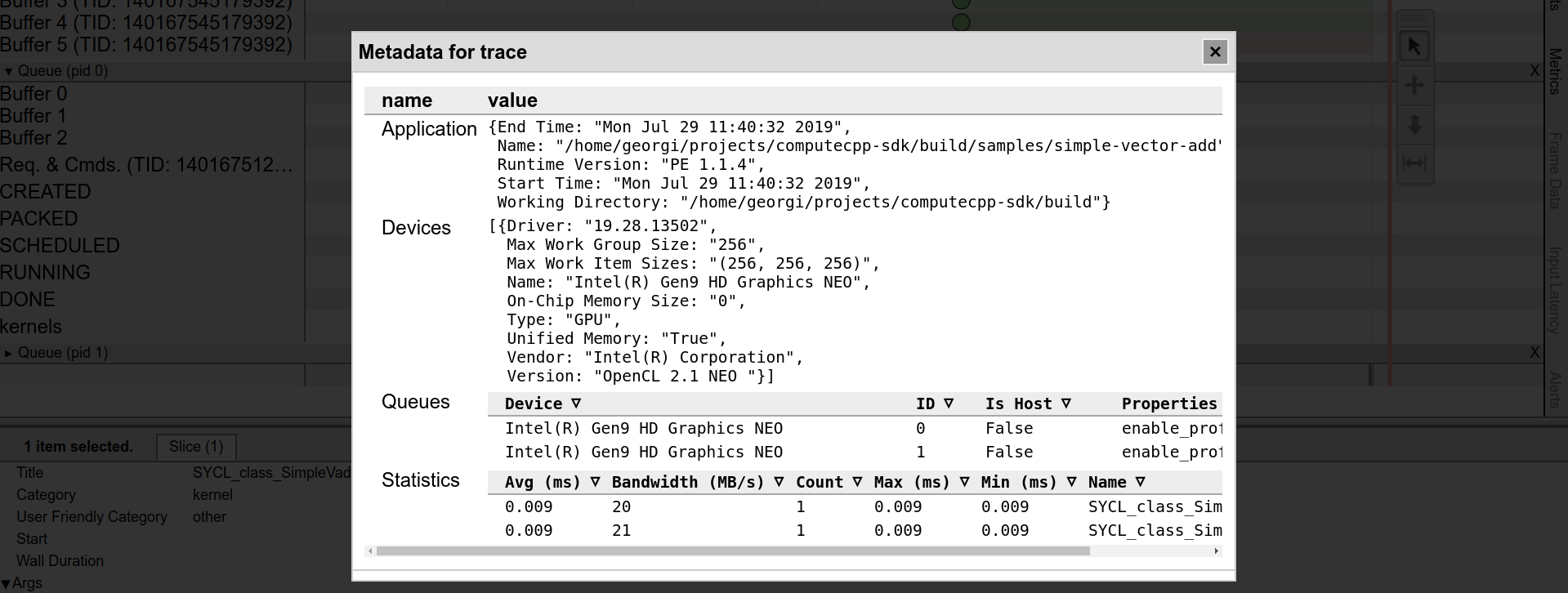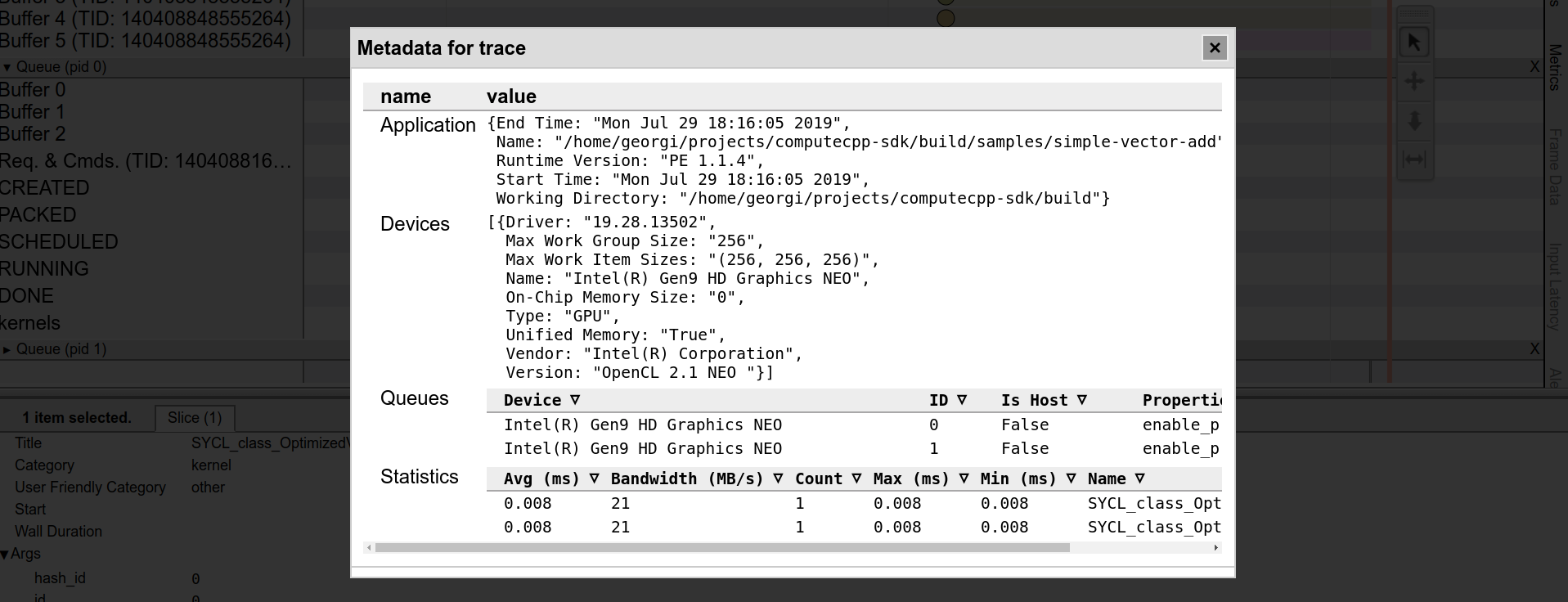 If you are looking for more summarized information of the execution rather than inspecting the timeline, you can make use of another great feature - the "Metadata for Trace" interface. You can click the M button in the top right of the tracer UI and a window that contains information about the Application, the Device it was ran on, the Queue instances and their properties, and Kernel Execution Statistics, will pop out. Here is an example from the same application that we profiled until now.