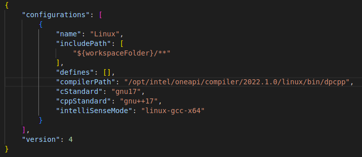 Figure 10: DPC++ configured IntelliSense file c_cpp_properties.json