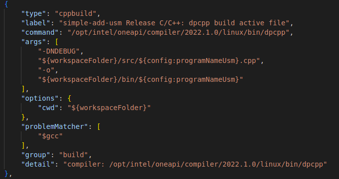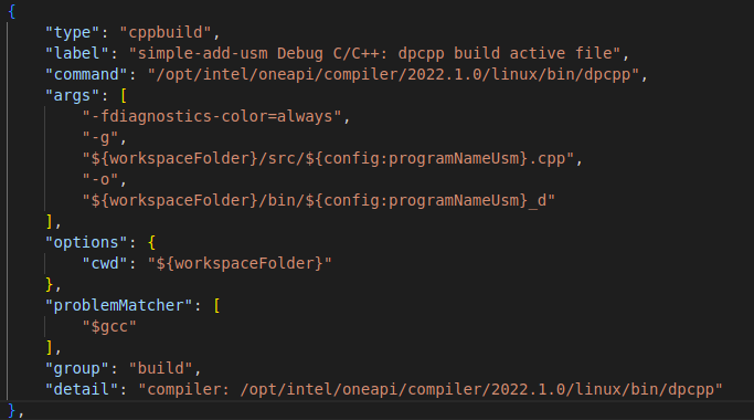 "name": "C/C++: dpc++ build and debug simple-add-usm". -
