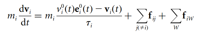 Helbing suggests that human behavior in large crowds is determined by three component forces: a personal impulse towards one’s destination, the cumulative force exerted by neighboring people and the repulsive force from any nearby walls. Together, these forces form the basis of the differential equation below, which can subsequently be integrated in order to calculate the person’s velocity.
