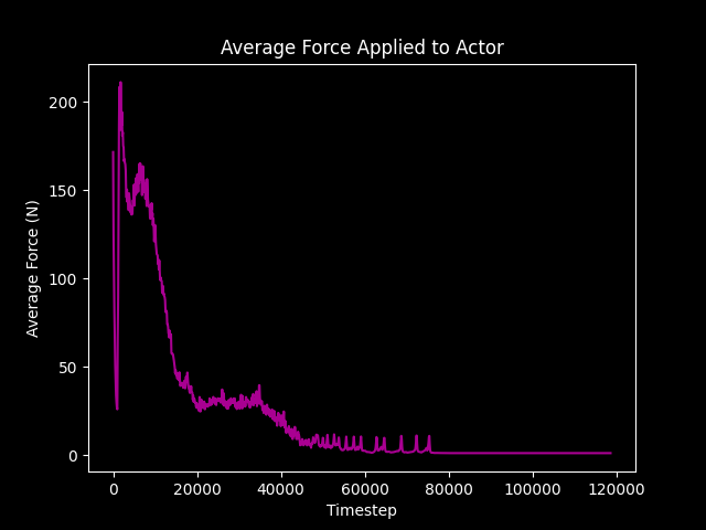 If we take a look at this graph charting the average force applied to each actor during each iteration, we can observe that the average force is at its highest when the two crowds are locked together, and the lanes are being formed. The average force tapers off once the two groups make their way past each other and actors begin to break out of the collision area. You can observe this in the video after the 1:45 mark where the crowd starts losing its density as actors are able to spread out into the available space.