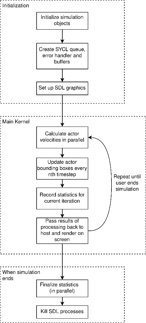 - Given the number of calculations it requires, we can assume that the most computationally intensive kernel will involve the calculation of actor velocities. Each actor will occupy a separate SYCL work-item