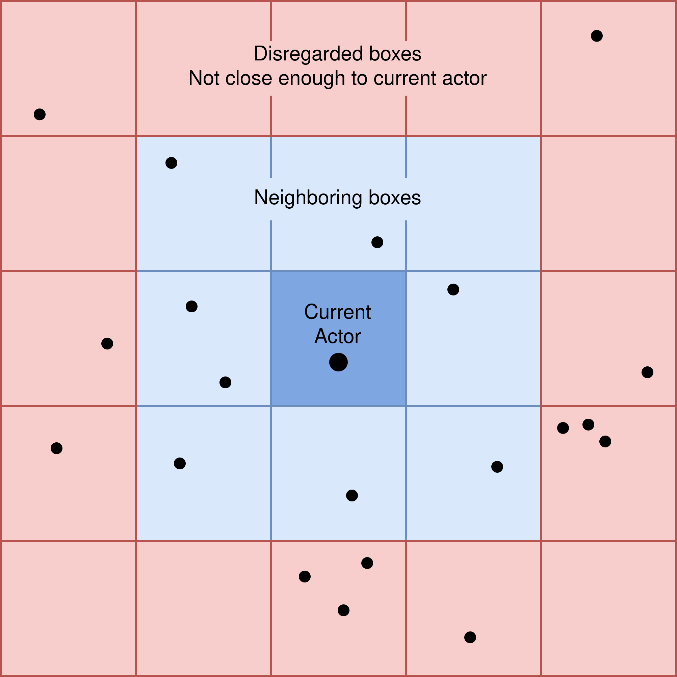 Ultimately, this is a fairly simple calculation with the most expensive operation being the calculation of the direction vector for the nearest point to the actor in the destination region (this is required because destinations are defined as rectangular regions rather than points). Once personal impulse has been calculated, the next step is to calculate the cumulative force exerted by neighboring actors. An early optimization we deemed necessary was the implementation of bounding boxes. The space in which the simulation takes place is split up into a grid, with each actor having an attribute for the box it belongs to. When calculating neighbor forces, only actors in the current actor’s bounding box and the 8 perimeter boxes are considered, operating on the assumption that an actor further away from the current actor is not likely to exert a force on them. Each actor’s bounding box is updated in parallel every 20th timestep.