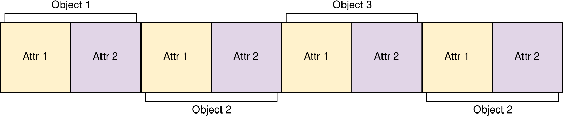Assume that our GPU accesses memory in chunks of 4 blocks. If we wanted to gather all of the values for attribute 1 using AoS, the GPU would require two memory access operations to get all the data it needs. However, using SoA it can fetch everything in one memory access. The general rule of thumb is that accessing data which is physically close together in memory is more efficient because we can make use of coalesced memory accesses. In its current form, the project uses AoS. Transitioning to SoA would likely bring major performance benefits, particularly because it is a memory-bound system, the trade-off being that it would require an entire restructuring of the code.