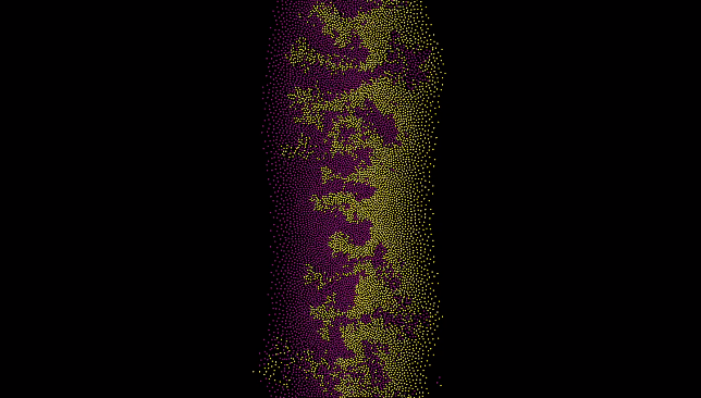 The video above shows two groups of 5000 actors charging into each other. It demonstrates a key phenomenon Helbing observed in his study of crowds and one which he wanted his model to emulate; that being “emergent lane formation.” When two crowds with different destinations meet, actors with the same destination will bunch together into disparate lanes carved out by “leader” actors propelled along by the momentum of the crowd behind them.