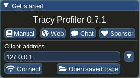 Opening Tracy will give you a configuration window. Here you can access the user manual, some useful links and a link to sponsor the project. For applications running on a remote machine, fill in the client address with the machine's IP address. You can also open a pre-recorded profiling session.