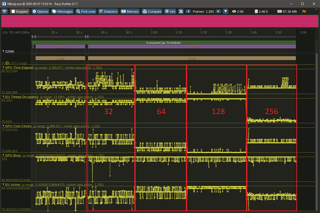 });The application was also modified to allow the tile size to be changed dynamically so we can see the performance counters for different tile sizes in the same image. To demonstrate that we can improve performance by changing the memory pattern access of a SYCL application, let's examine a capture of a simulation with 16k bodies.