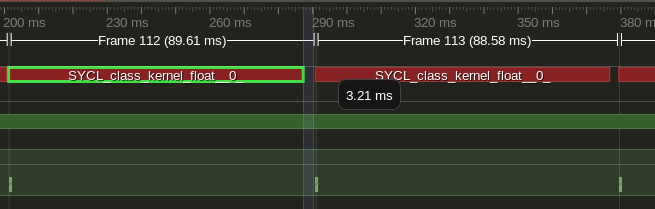 By launching several kernels in a loop like this, ComputeCpp can fast-enqueue the kernels. This means that all launches are going to be grouped, see how this looks in the following image: